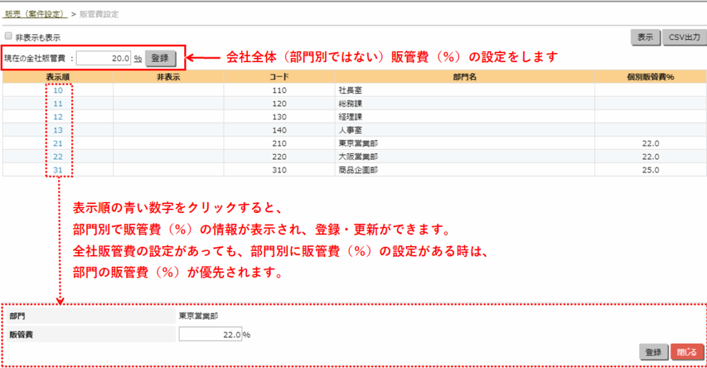 販売費設定は、全社販管費と部門別で比率の登録ができます。