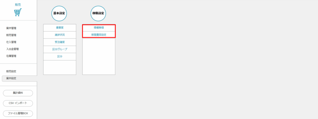 稼働単価は、プロジェクト(案件)に対する従業員の1時間あたりの稼働費を設定することができ、販管費設定では部門別に販管費の比率を設定できます。