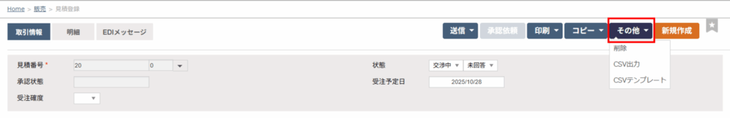 見積登録の画面にある「その他」より、通常のCSV出力の以外にCSVテンプレートが出力できます。