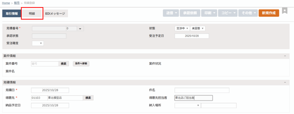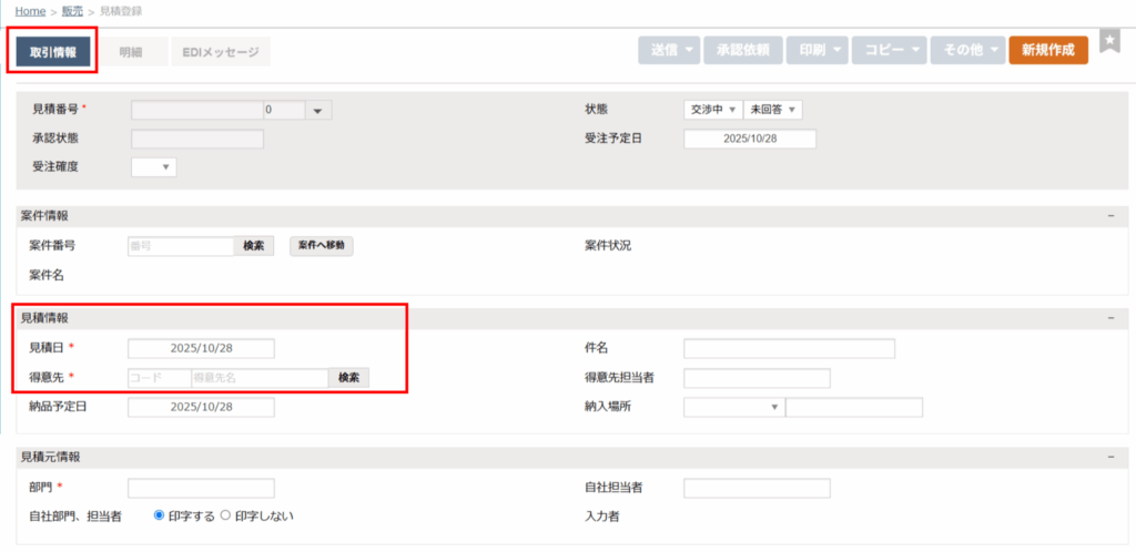 見積登録の「取引情報」タブの必須項目は「見積日」と「得意先」です。