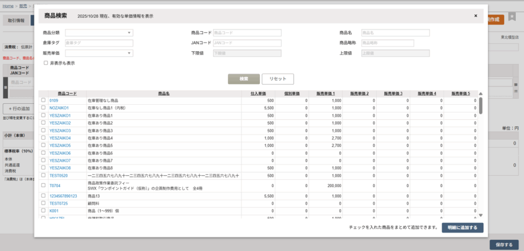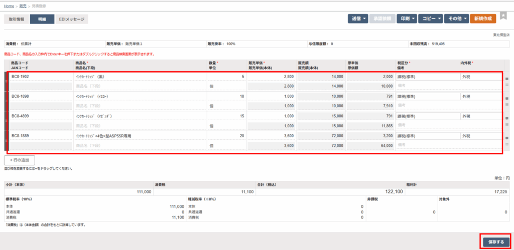 商品コード左横のチェックボックスを選択して、検索画面右下の「明細に追加する」ボタンをクリックします。 - 「保存する」ボタンをクリックします。