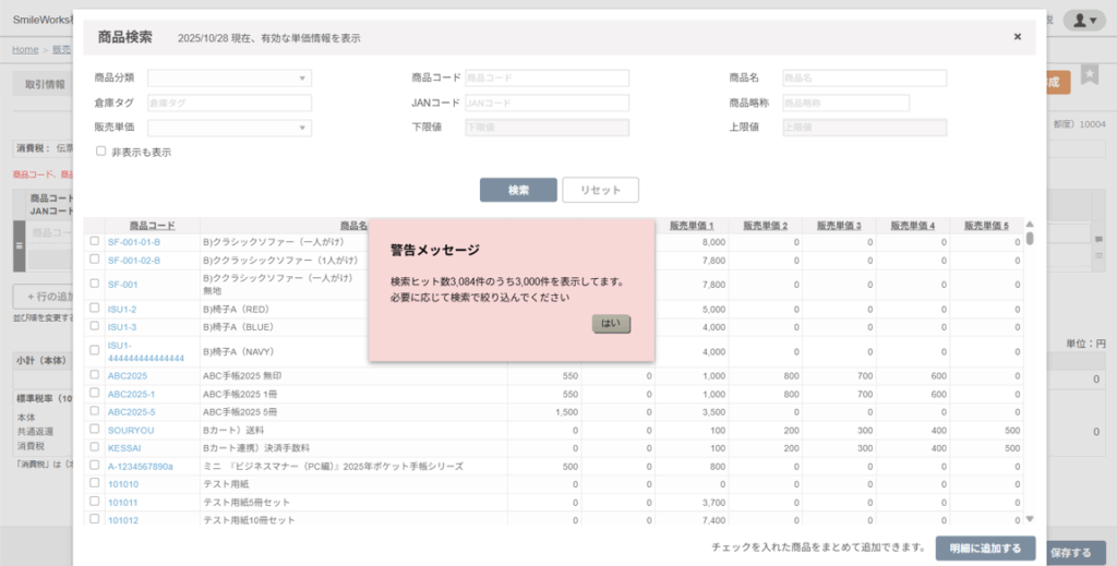 初期表示は100件までです。100件以上表示させる場合は、もう一度「検索」をクリックしてください。ただし、3,000件以上ある場合は下記の警告メッセージが表示されます。