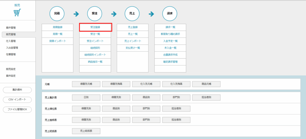 - 「販売」>「販売管理」>「受注登録」をクリックします。