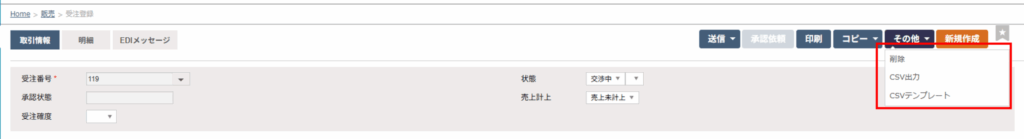 受注登録の画面にある「その他」より、通常のCSV出力の以外にCSVテンプレートが出力できます。