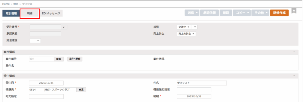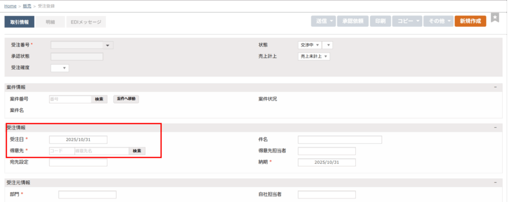 受注登録の「取引情報」タブの必須項目は「受注日」と「得意先」「納期」「部門(自社担当部門)」です。得意先をセットすると、得意先に設定している取引条件が自動反映します。