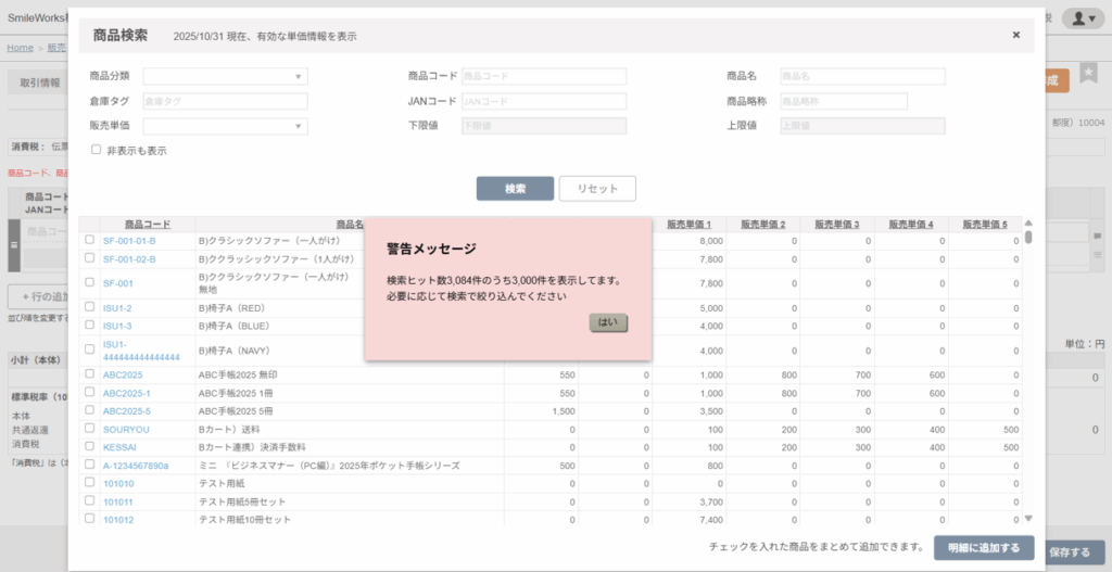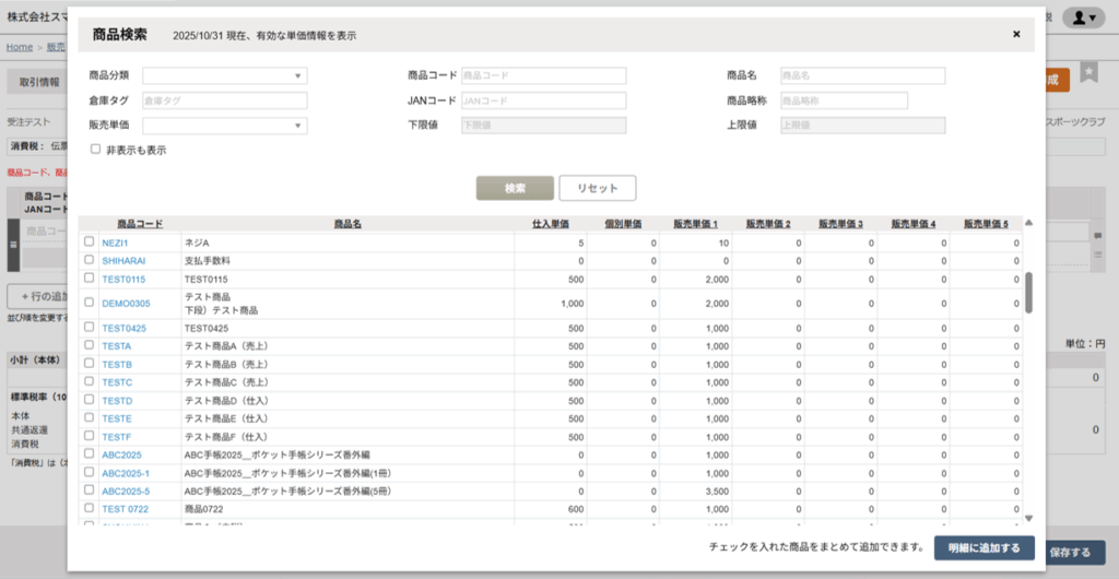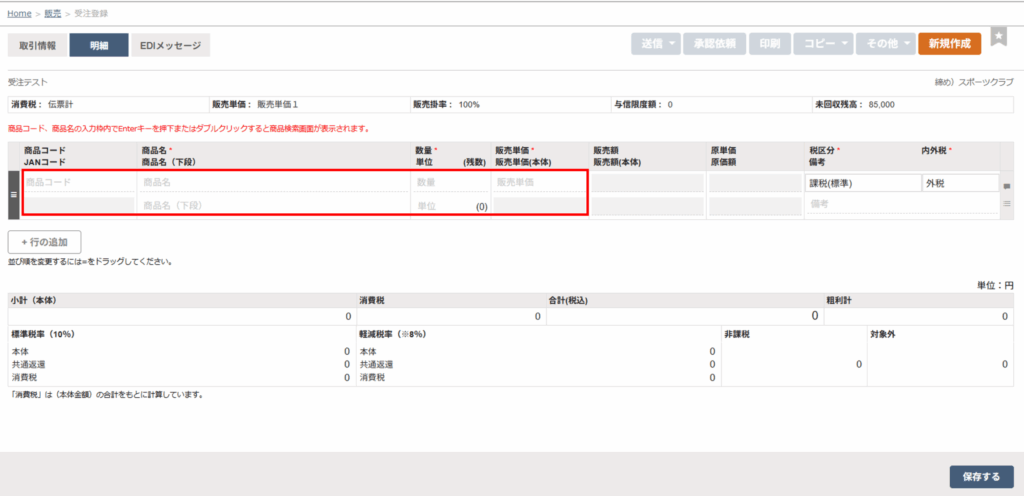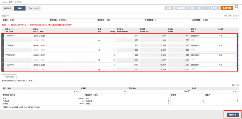 商品コード左横のチェックボックスを選択して、検索画面右下の「明細に追加する」ボタンをクリックします。 - 「保存する」ボタンをクリックします。