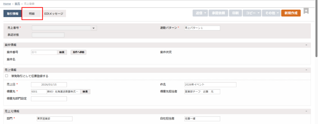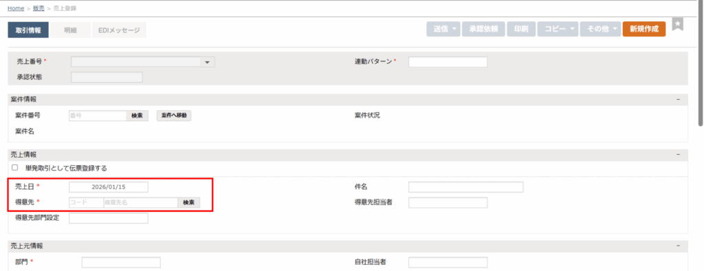 売上登録の「取引情報」タブの必須項目は「売上日」と「得意先」「部門(自社担当部門)」です。得意先をセットすると、得意先に設定している取引条件が自動反映します。