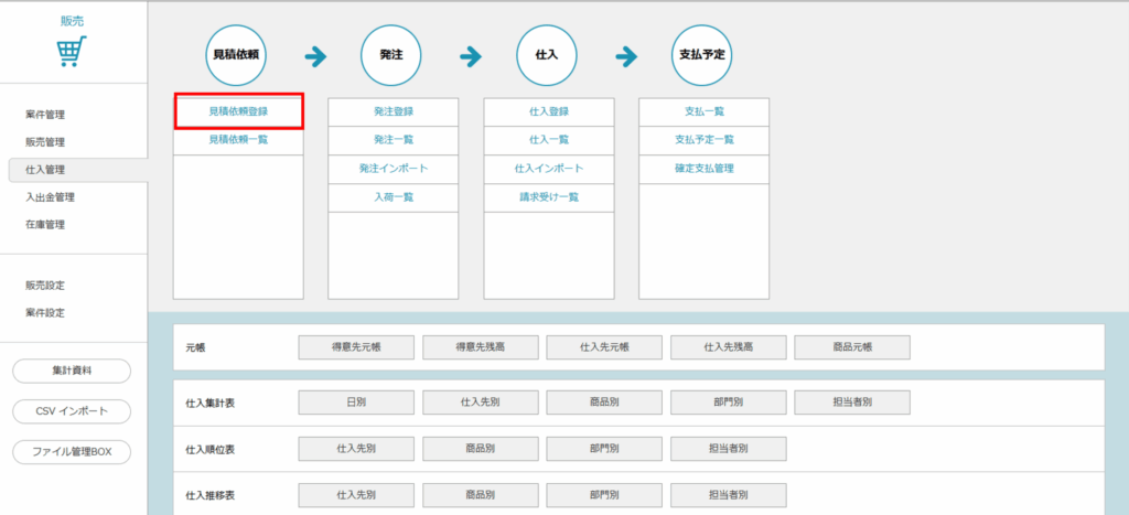 - 「販売」>「仕入管理」>「見積依頼」をクリックします。
