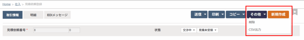 見積依頼登録の画面にある「その他」より、CSV出力ができます。