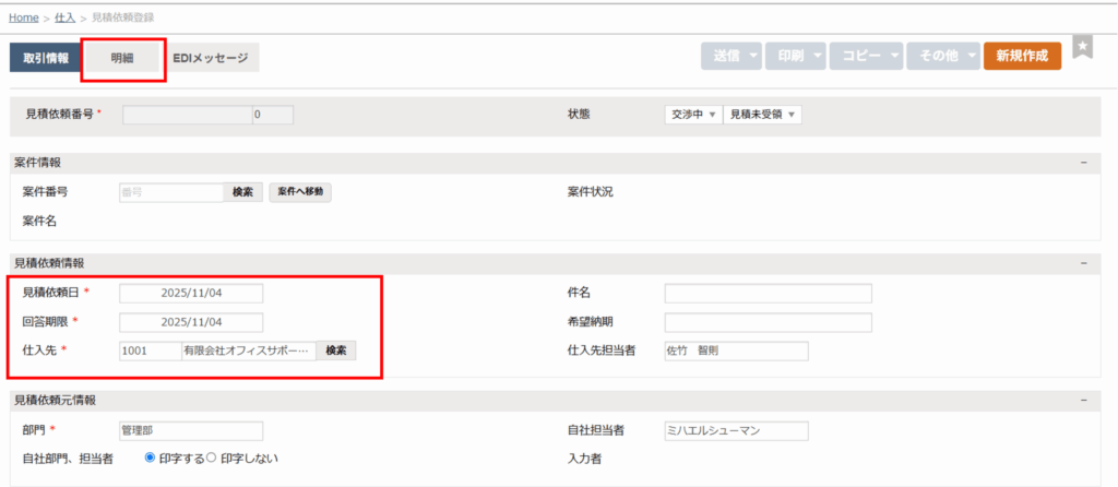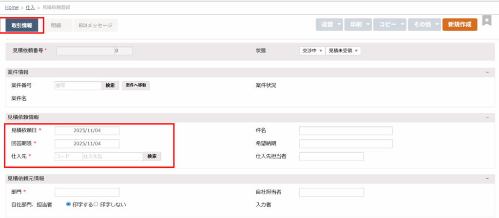 見積依頼の「取引情報」タブの必須項目は「見積依頼日」「仕入先」「回答期限」「部門(自社の担当部門」です。仕入先をセットすると、仕入先に設定している取引条件が自動反映します。