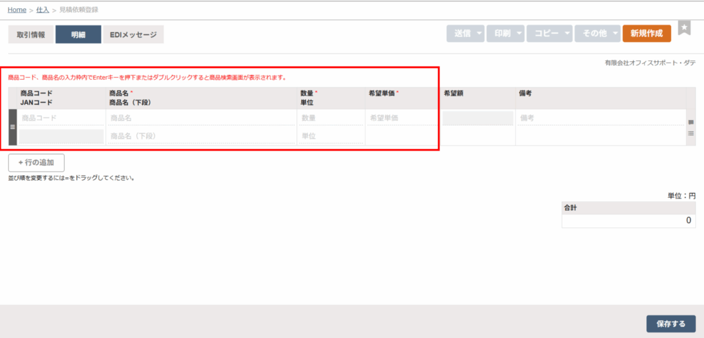 見積依頼登録の画面にある各項目の解説は、画面右上の「画面解説」をご参照ください。
