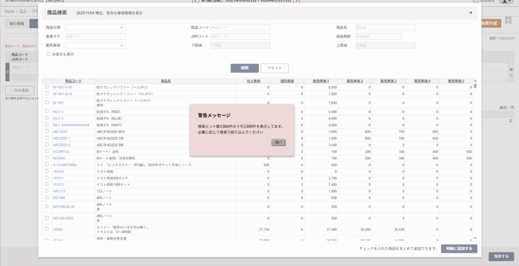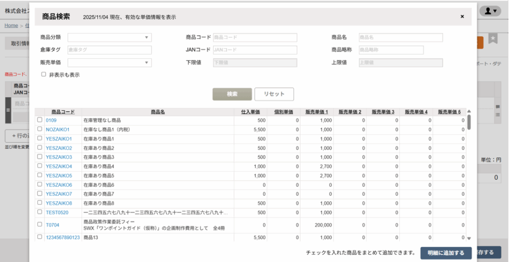 商品コード左横のチェックボックスを選択して、検索画面右下の「明細に追加する」ボタンをクリックします。