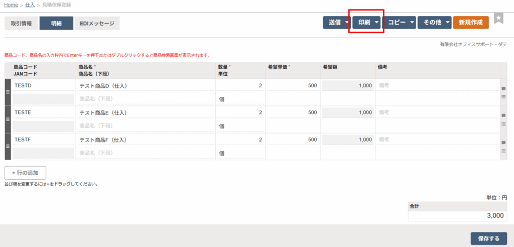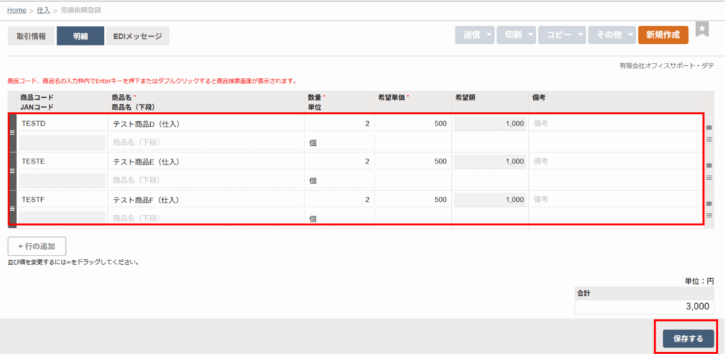 一度、保存した伝票を開いて、何らかの修正をした場合も、「保存する」ボタンをクリックしないと修正の内容が反映されませんのでご注意ください。