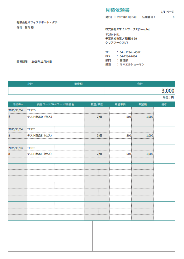 ※「見積依頼」についてはCSVインポート機能がありません。そのため、他の登録にあるCSVテンプレート出力はありません。