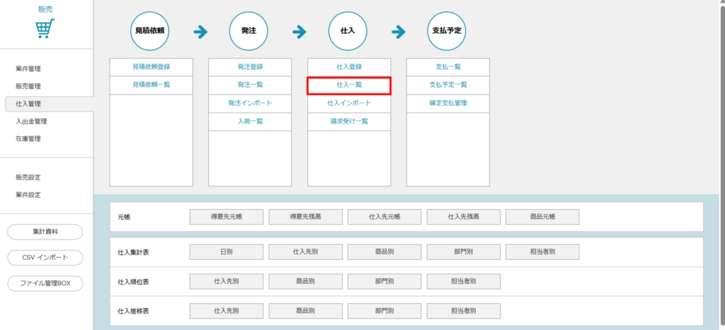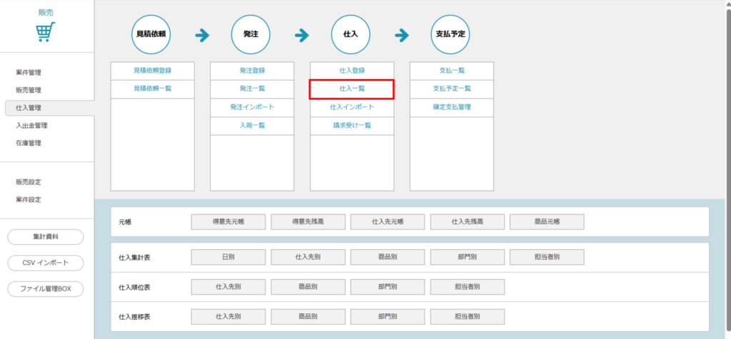 - 「販売」>「仕入管理」>「仕入一覧」をクリックします。