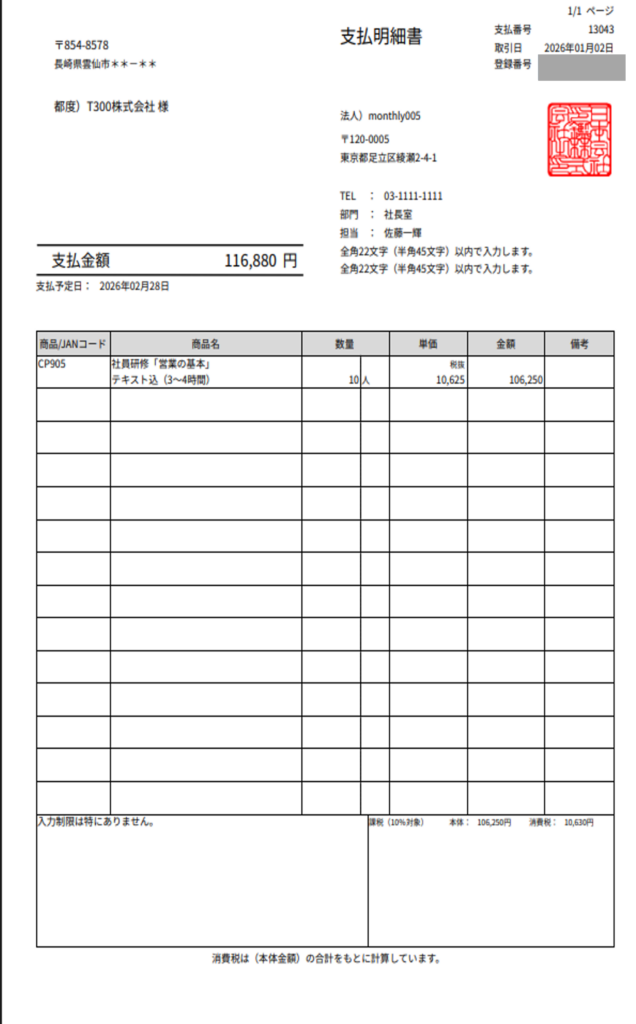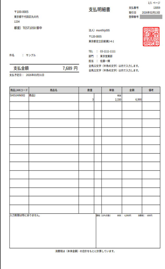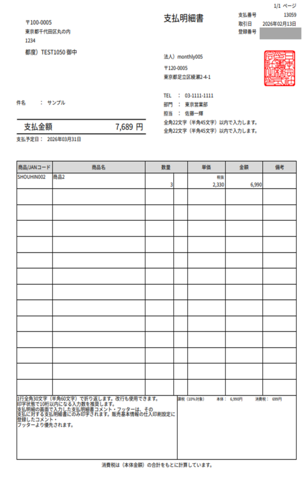 ※赤枠に記載されたコメントは、販売基本情報「仕入印刷設定」に登録されたコメントより優先されます。 - 支払明細書がPDFで表示されます。