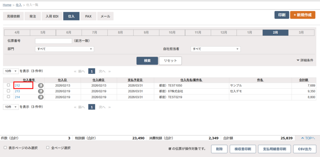 - 「仕入一覧」から、該当の仕入番号をクリックし、伝票を開きます。