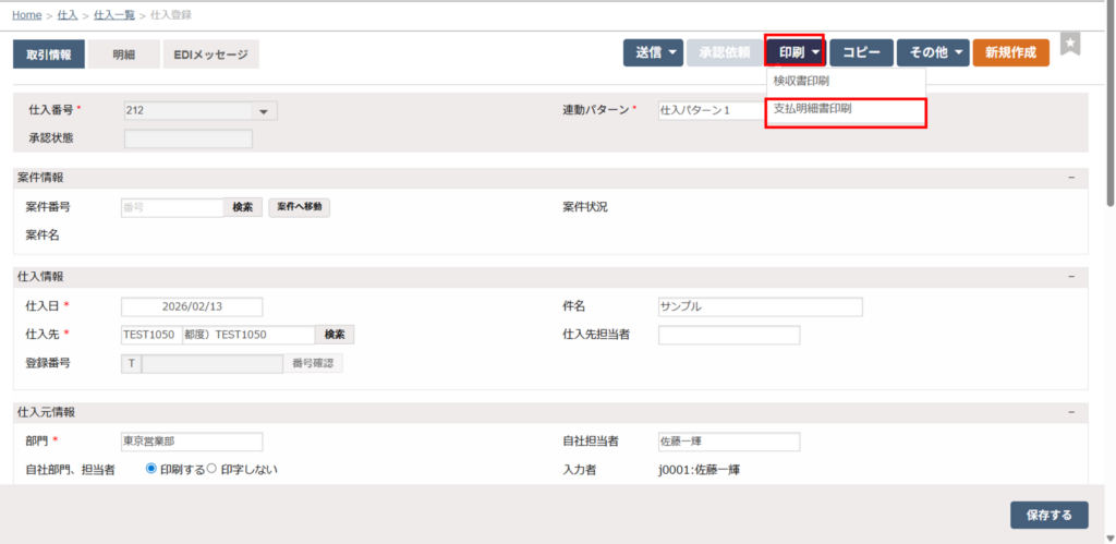 仕入登録の画面から支払明細書を発行する