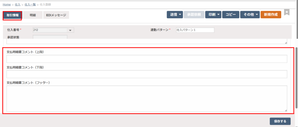 特定の支払明細書にコメントを追加したい場合は、こちらの各仕入伝票の「取引情報」タブの下部「支払明細コメント」欄に記載ください。販売(販売設定)>販売基本情報の「仕入印刷設定」タブに記載のコメントよりも優先されます。