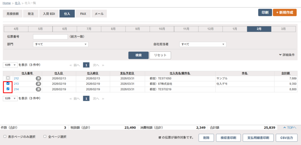 - 「仕入一覧」から、該当の伝票にチェックを付けます。複数選択も可能です。