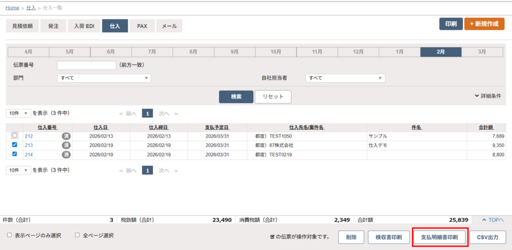 仕入一覧から発行する(複数の支払明細書を一括で印刷する)