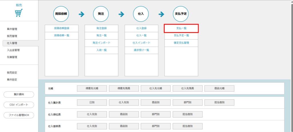 1.「販売」>「仕入管理」>「支払一覧」をクリックします。