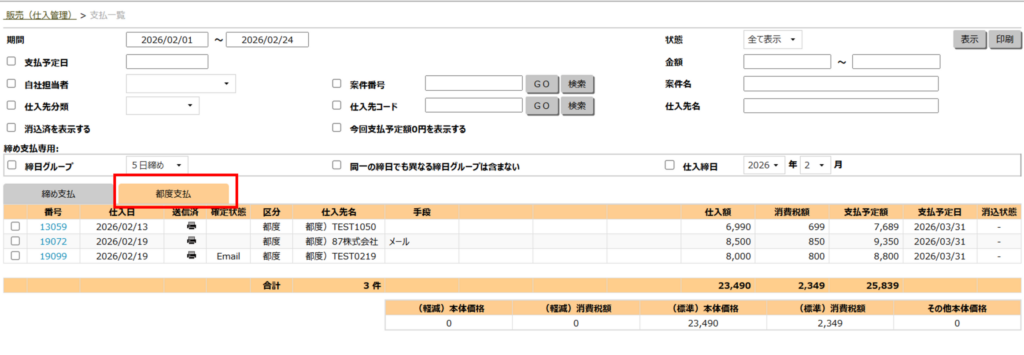 - 「支払一覧」の「都度支払」タブをクリックします。タブ背景がオレンジ色になると切り替わっています。
