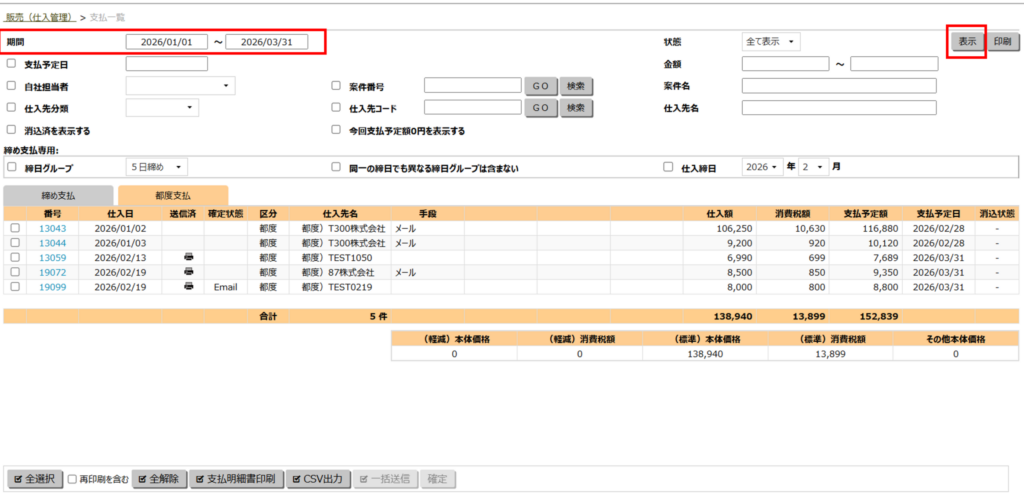 - 支払明細書を発行したい取引の期間や、必要に応じて画面上部の条件などを指定して「表示」ボタンをクリックします。