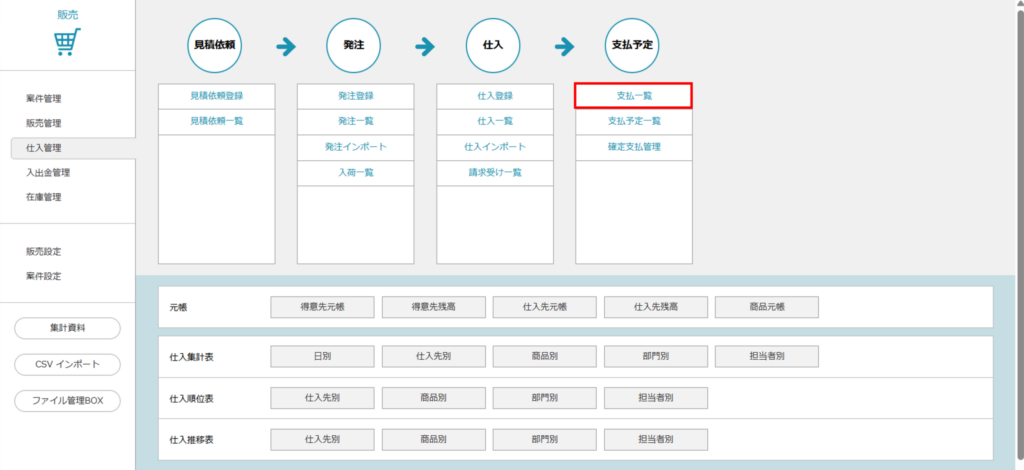 1. 「販売」>「仕入管理」>「支払一覧」をクリックします。