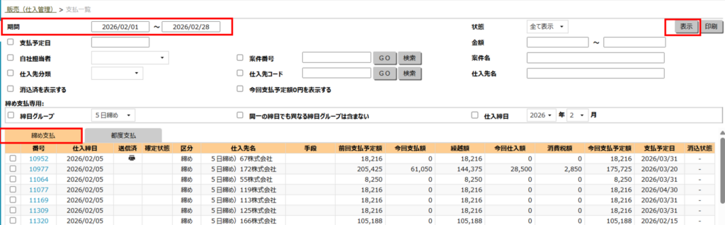 2. 支払明細書を発行したい取引の期間や、画面上部の「締め支払専用」枠にある条件などを指定して「表示」ボタンをクリックします。