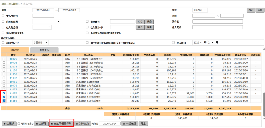 3. 支払明細書を発行したい支払行の左欄にチェックを付け、画面下部にある「支払明細書印刷」ボタンをクリックします。複数選択も可能です。
