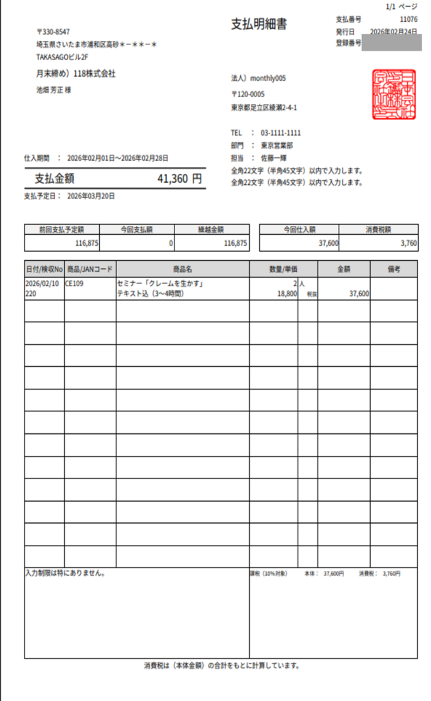 支払区分が「掛け(締め)」の支払明細書は、「支払一覧」から発行します。
