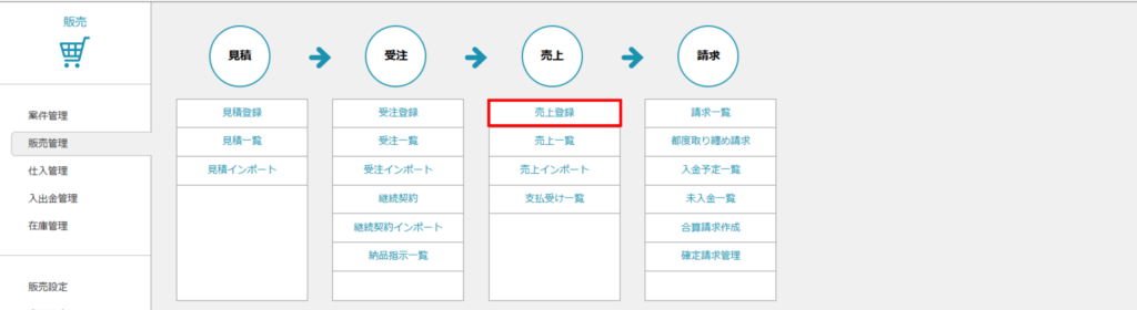 - 「販売」>「販売管理」>「売上登録」にアクセスします。