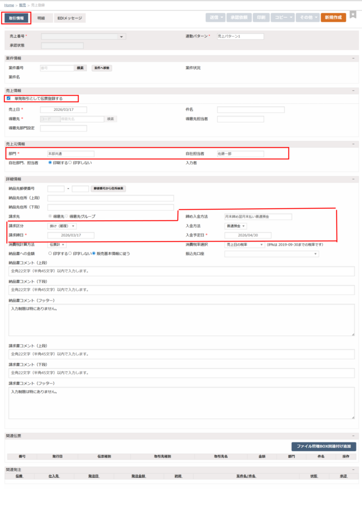 「売上情報」「詳細情報」欄は、「販売基本情報」の「初期値設定」タブで設定した内容をもとに、情報が自動で反映されます。