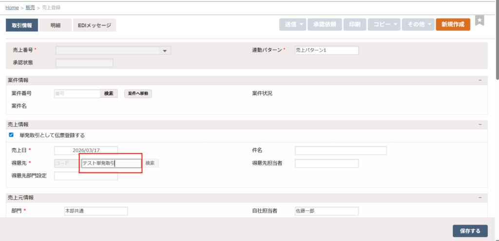 単発取引「得意先」を利用して売上伝票を登録する