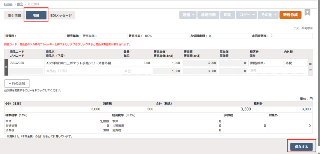 - その他の必要事項、「明細」タブの内容を入力し、「保存する」ボタンをクリックします。