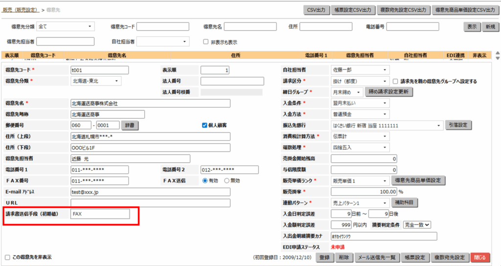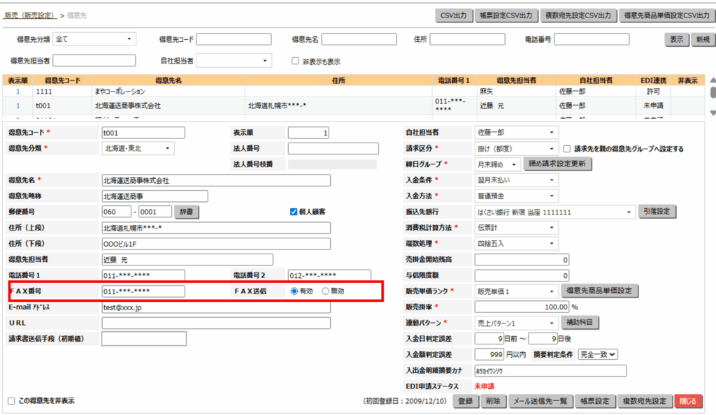 FAX送信オプションをご契約後は、FAX送信を行いたい「得意先」「仕入先」のマスタ設定で、「FAX送信」を有効にします。
