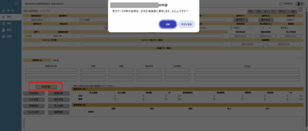 - 「販売」>「案件管理」>「案件登録」の「前へ」ボタン、あるいは「販売」>「案件管理」>「案件一覧」画面から、収支計画データを作成したい案件データを表示させます。