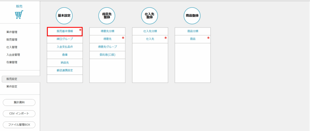 1. 「販売」>「販売設定」>「販売基本情報」にアクセスします。
