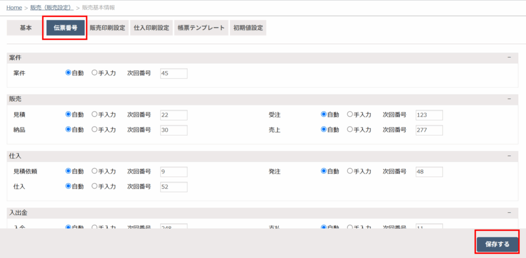 2. 「伝票番号」タブで、変更を行いたい伝票の設定を「手入力」にし、「保存する」ボタンをクリックます。
