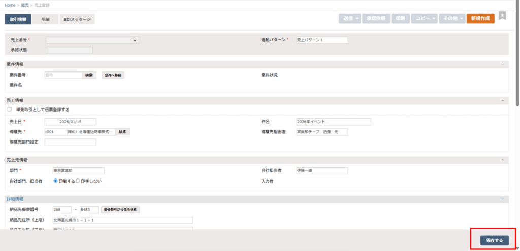 4. 「取引情報」「明細」タブそれぞれを編集します。