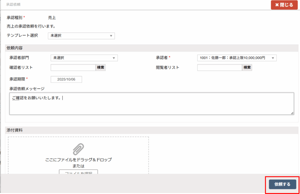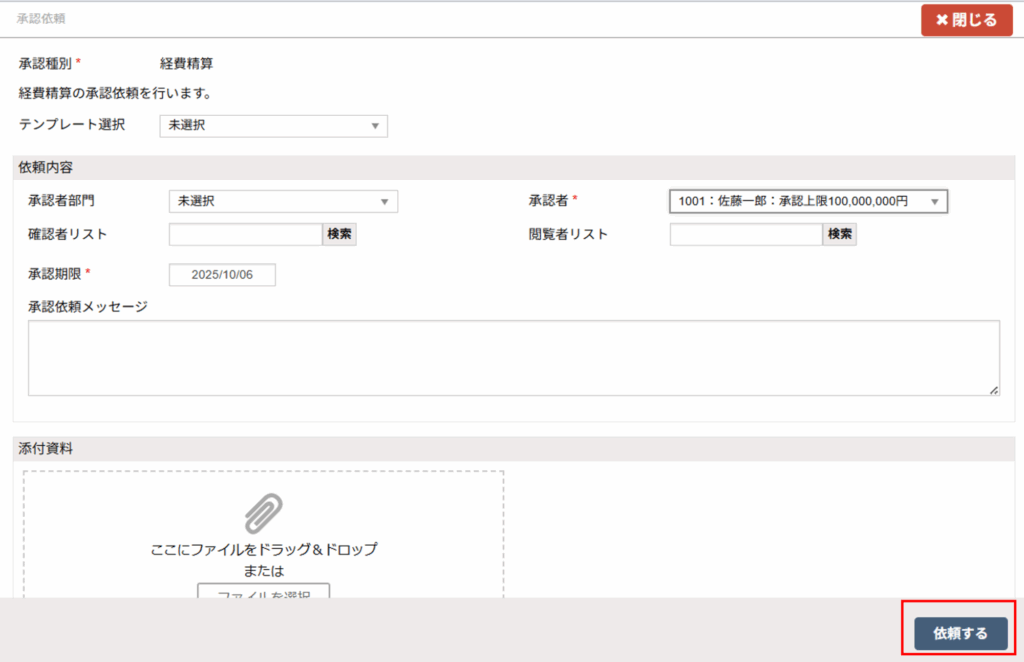 - 「承認依頼画面で必須情報を入力後、「依頼する」ボタンをクリックし、承認者へ承認依頼を行います。