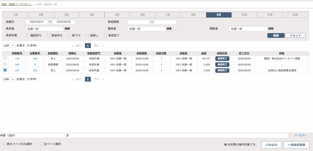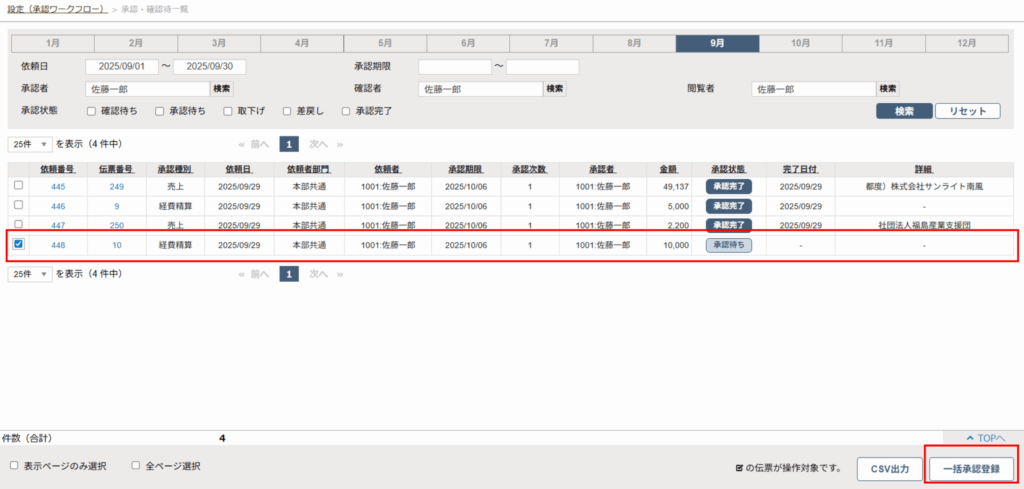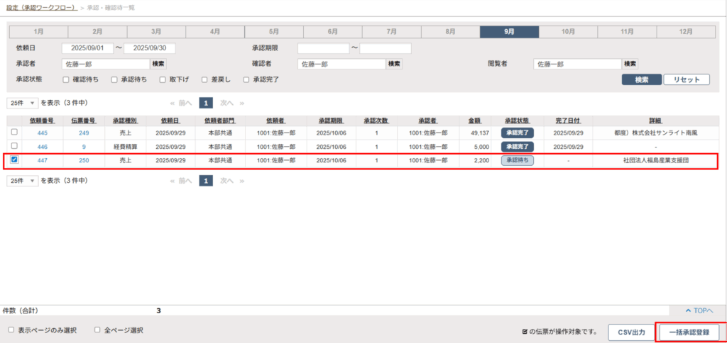 - 対象の承認依頼伝票を確認した上で、チェックボックスにチェックを入れ、「一括承認登録」ボタンをクリックします。
