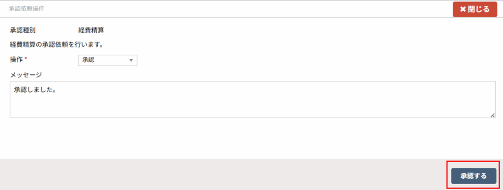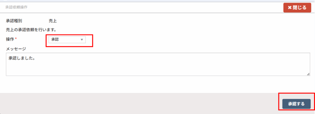 - デフォルトで操作に「承認」がセットされ、「承認する」ボタンをクリックすると承認完了になります。