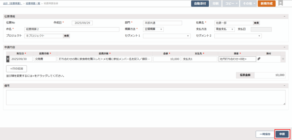 - 「会計」>「日次」>「経費精算」画面にアクセスし、承認依頼対象伝票を申請します。